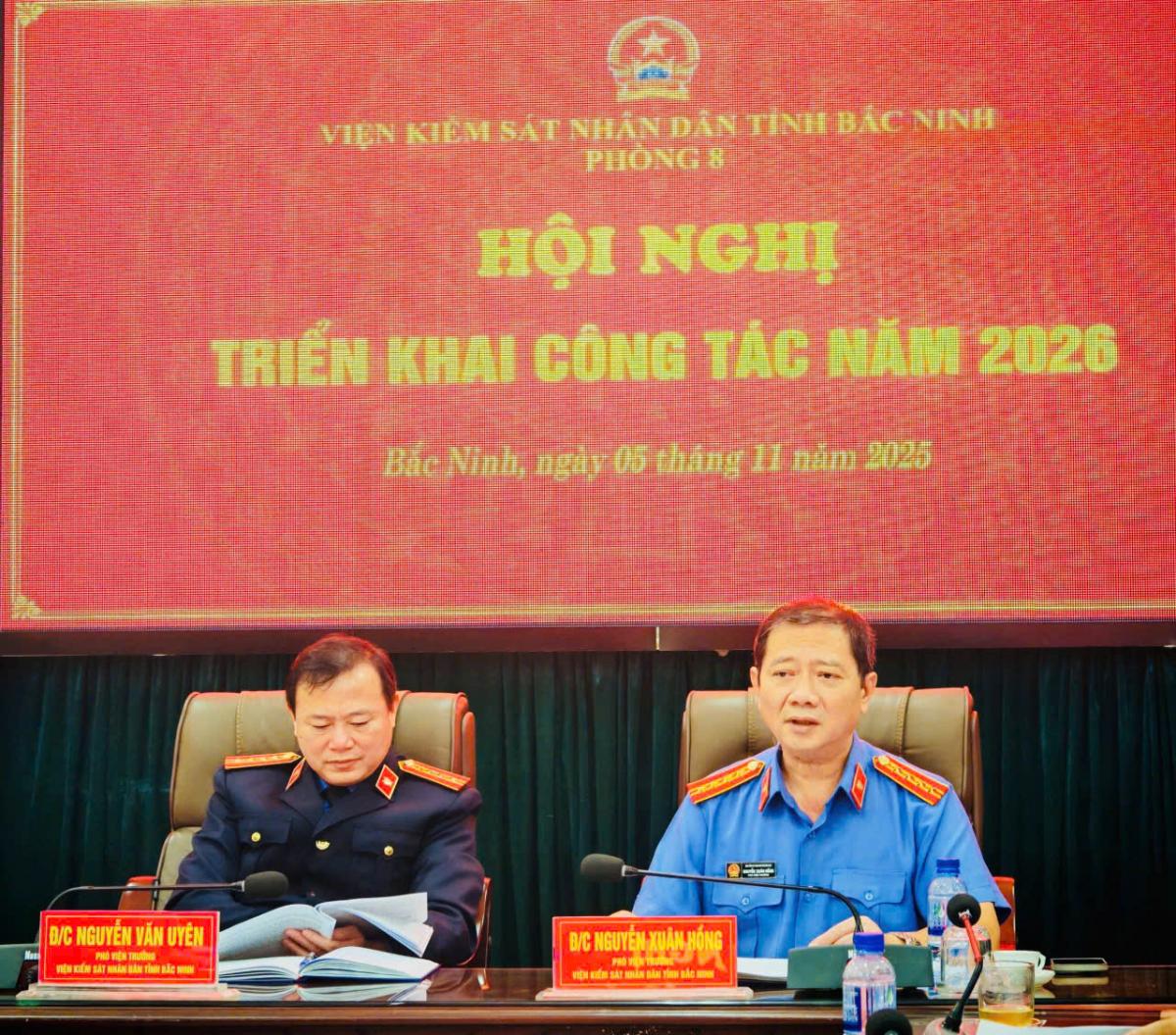 Phát biểu chỉ đạo tại Hội nghị, đồng chí Nguyễn Xuân Hồng, đồng chí Nguyễn Văn Uyên đã ghi nhận, đánh giá cao những kết quả, thành tích của Phòng 8 đã đạt được trong năm 2025; đồng thời, yêu cầu đơn vị tiếp tục phát huy tinh thần đoàn kết; tích cực, chủ động tham mưu cho lãnh đạo Viện nâng cao hơn nữa chất lượng, hiệu quả công tác kiểm sát việc tạm giữ, tạm giam và thi hành án; đổi mới công tác kiểm sát hoạt động tư pháp theo yêu cầu 4T “Tận tâm, tinh thông, thực chất, thuyết phục” trong đó chú trọng, đẩy mạnh chuyển đổi số và ứng dụng công nghệ thông tin theo hướng “Số hóa toàn diện”; tổ chức thực hiện tốt các phong trào thi đua, gắn việc thực hiện nhiệm vụ với các nội dung, chương trình thi đua của ngành, địa phương, góp phần vào thành tích chung của cơ quan, của ngành trong năm 2026.