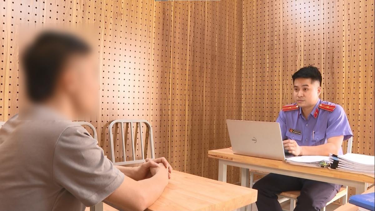 Ảnh: Kiểm sát viên hỏi cung bị can trong đường dây lừa đảo